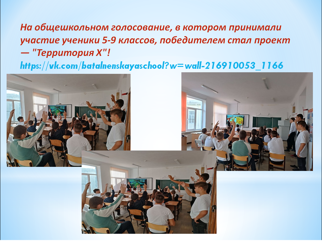 На общешкольном голосование, в котором принимали участие ученики 5-9 классов, победителем стал проект — "Территория X"!